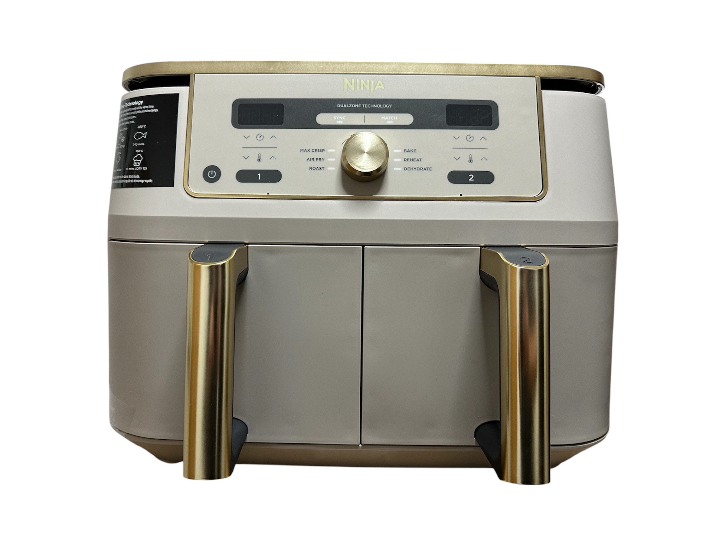 Die Ninja DZ400EUSTGD bringt 9,5 Liter Gesamtvolumen in zwei separaten 4,75-Liter-Schubladen – genug für eine ganze Mahlzeit für 2–4 Personen. In jeden Korb passen bis zu 1,4 kg Pommes oder ein 2 kg schweres Hähnchen. 6 Zubereitungsfunktionen: Heißluft-Frittieren, Max Crisp (bis 240 °C), Braten, Backen, Dörren und Aufwärmen. Per SYNC-Funktion enden beide Schubladen gleichzeitig – egal ob unterschiedliche Programme oder Garzeiten. Die Körbe und Crisper-Einsätze sind spülmaschinenfest. Leistung: 2.470 Watt. Farbe: Stone/Gold – exklusives Amazon-Design. Im Lieferumfang enthalten: 2 Schubladen, 2 Crisper-Gittereinsätze, Rezeptheft.