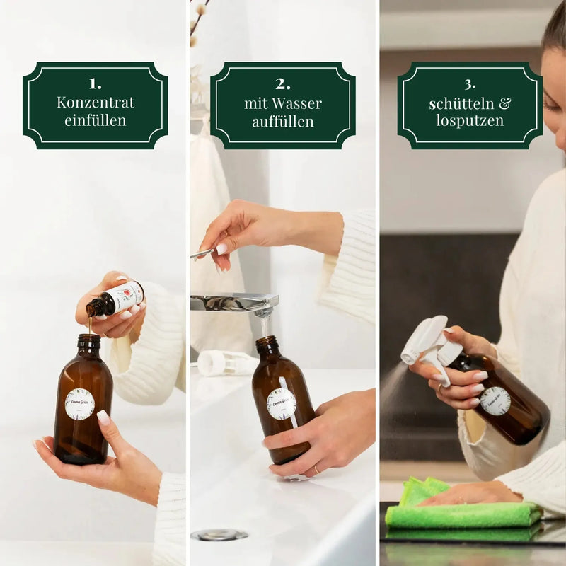Konzentrat einfüllen, Flasche mit Wasser auffüllen, schütteln — fertig. Der Reiniger